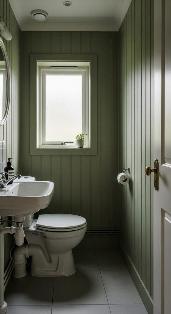 In small cloakroom toilets, vertical wall panelling adds instant depth and character without taking up floor space. We recommend tongue and groove or MDF panelling painted in a muted tone, such as sage or navy, to give the room warmth and texture. This approach works particularly well in a downstairs toilet panelling scheme, drawing the eye upwards and making the space feel taller. It’s a subtle architectural detail that adds value without overwhelming a tiny footprint.