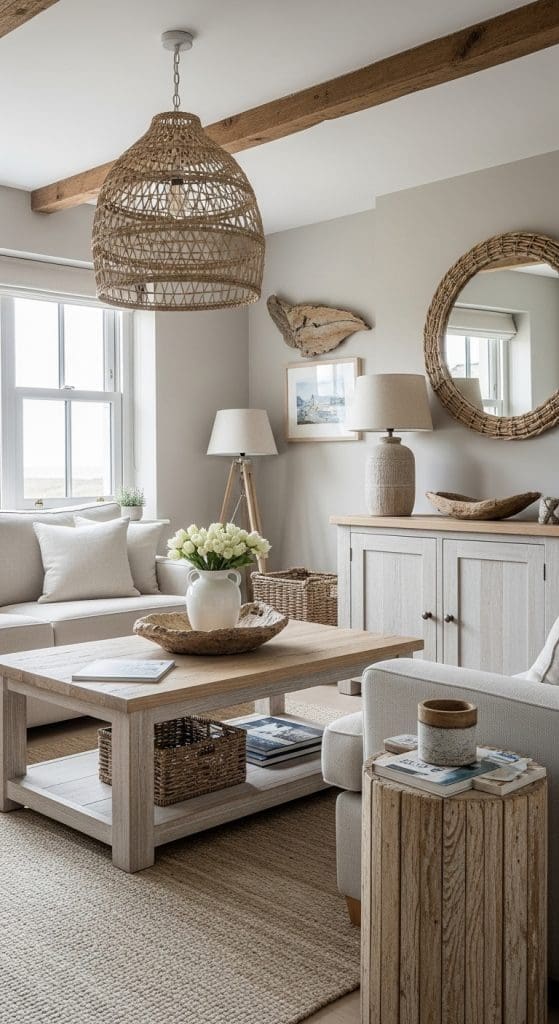 14. Style with Driftwood or Coral Accents in a Coastal Casual Living Room