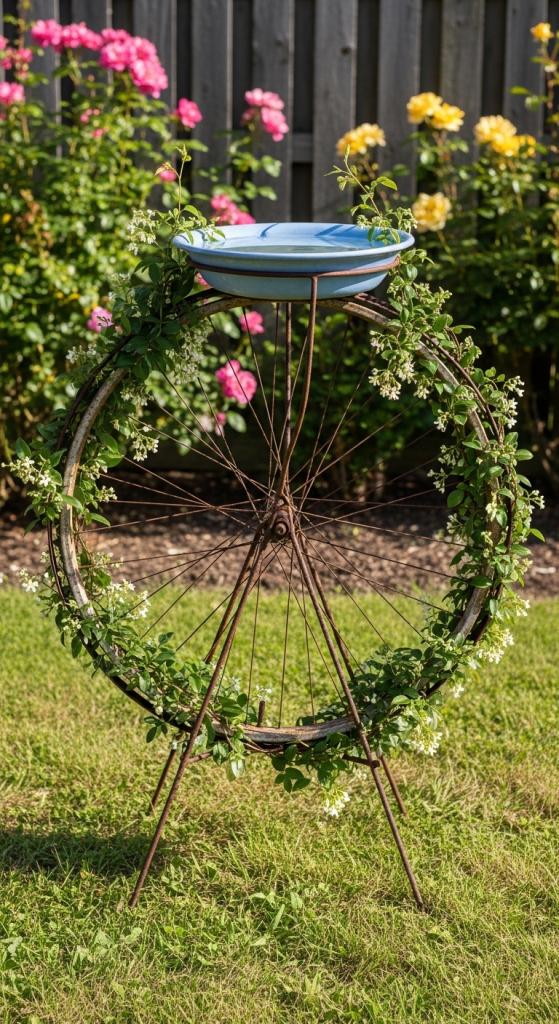 Use an old bicycle wheel as a decorative base and attach a shallow bowl in the center.