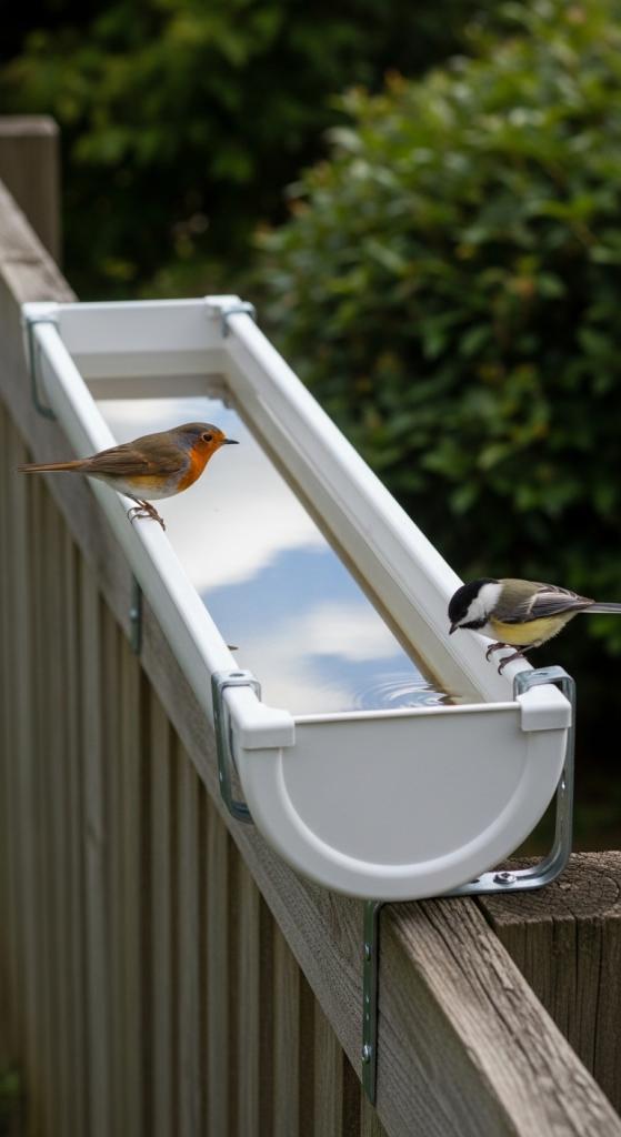 Cut a short section of plastic guttering and cap both ends to create a long, narrow basin. Mount it on a fence or railing.