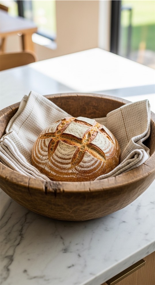 Use the dough bowl to hold a folded linen and a loaf of fresh bread when hosting.