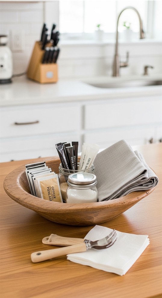 Turn your dough bowl into a small coffee essentials zone with sugar packets, stir sticks, and folded napkins.