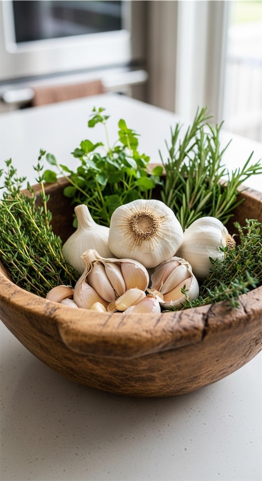 The pale garlic skins and green herbs create natural contrast. It’s both decorative and useful during meal prep.