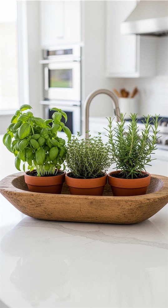 Place three small potted herbs inside your dough bowl, basil, thyme, and rosemary work beautifully.