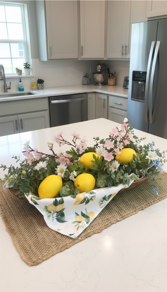 Dough bowl ideas for kitchen island spring decor often feel brightest with citrus and florals together.