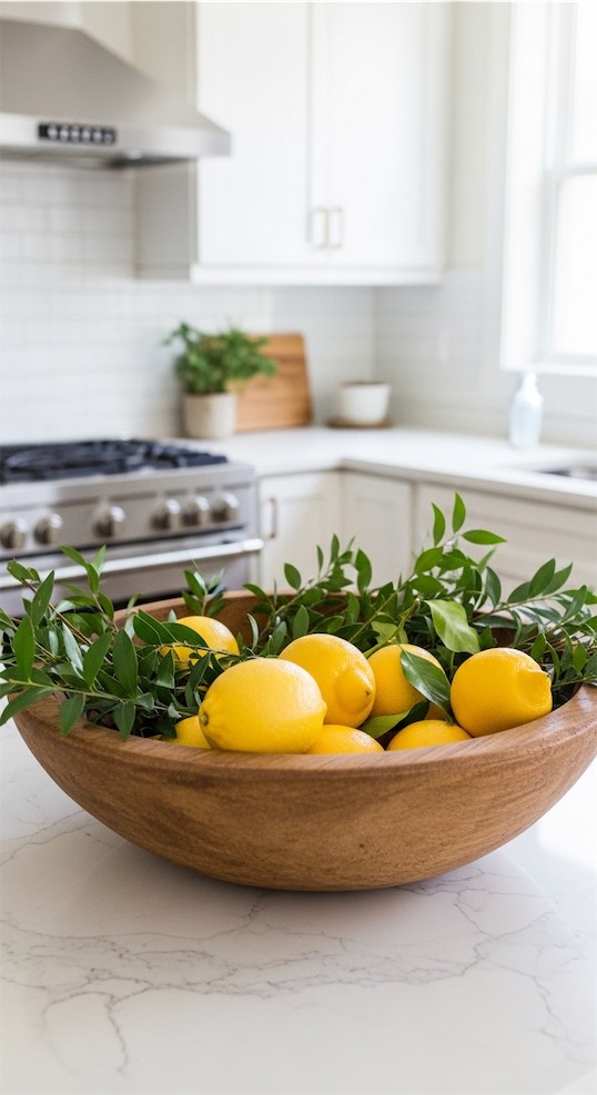 Dough bowl ideas for kitchen island setups that use real produce add color without introducing clutter, and you can grab the lemons for cooking or drinks anytime.