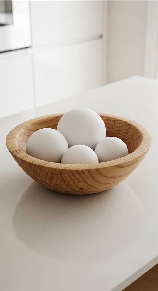Arrange a few matte white ceramic spheres or beads inside the dough bowl for a sculptural, modern look.