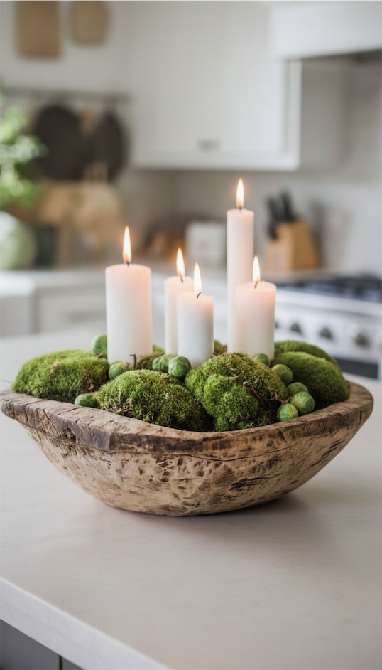 The natural green texture softens the wood tone of the bowl while the candles add height and glow, which keeps your kitchen island from feeling flat.