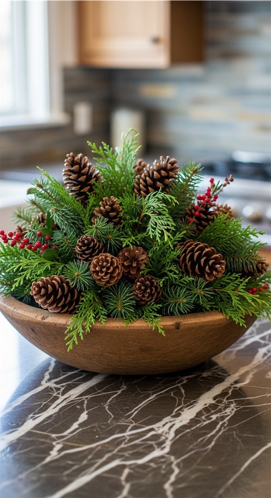 Dough bowl ideas for kitchen island winter decor that use natural elements feel relaxed rather than holiday themed.