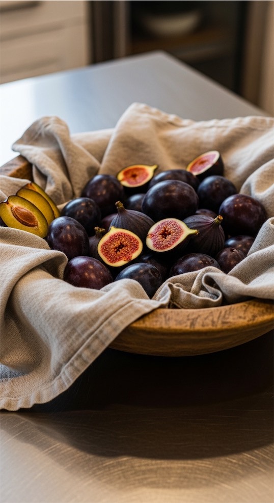 Fill the dough bowl with figs or plums resting on a soft folded linen.