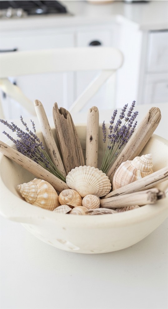 For coastal or summer kitchens, arrange small driftwood pieces and neutral shells inside the dough bowl.
