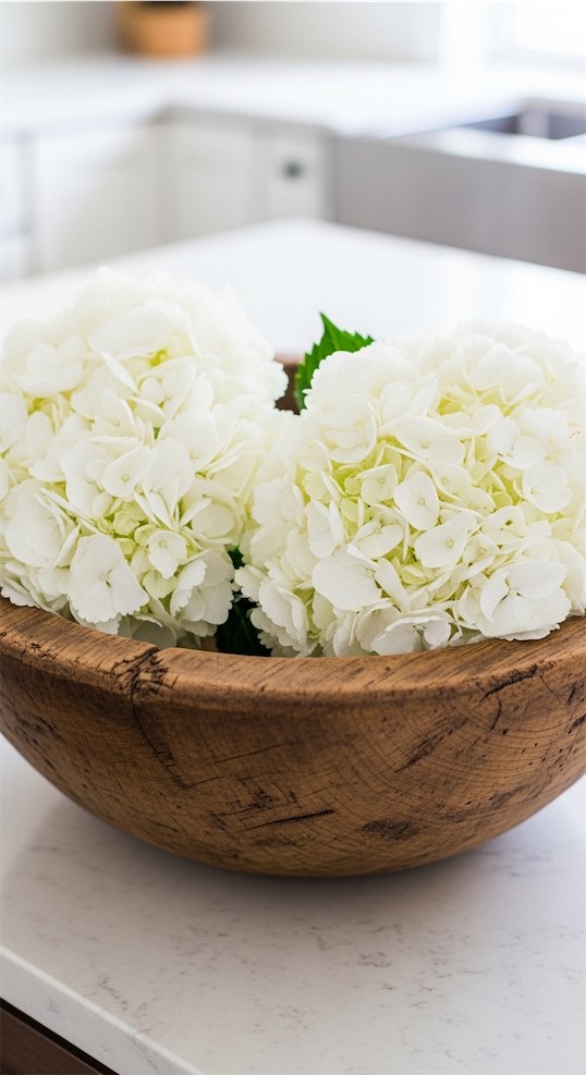 Dough bowl ideas for kitchen island floral styling often look best with fewer, fuller blooms.