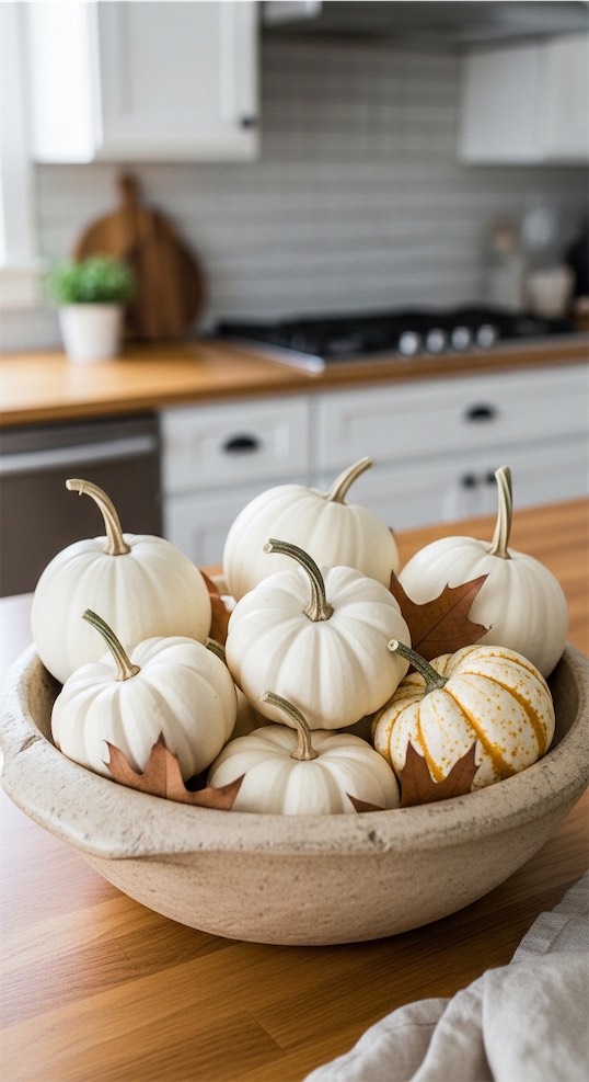 Dough bowl ideas for kitchen island seasonal decor don’t have to be orange or bold to feel autumnal.