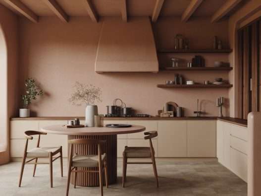Soft clay or blush-toned walls create a subtle earthy tone kitchen backdrop that feels calm and cozy. This muted shade pairs well with both light wood and black accents for a balanced, natural look.