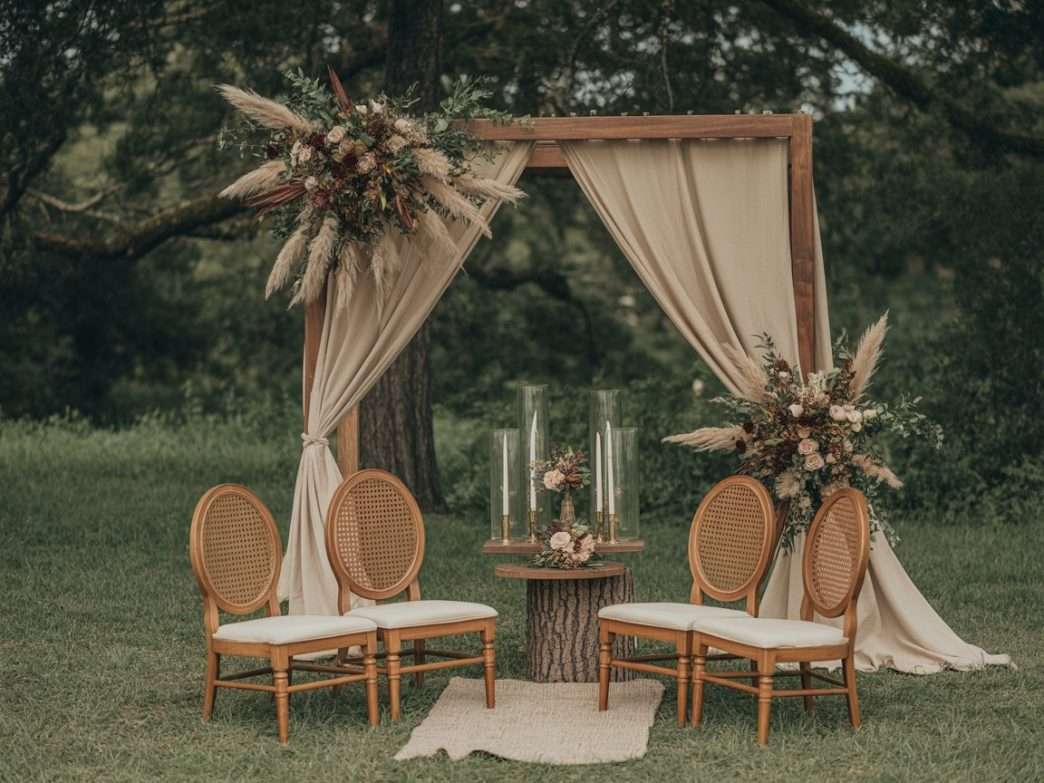 Transform a backyard or family garden into an earthy haven with string lights, handmade signs, and cozy natural seating. It’s intimate, affordable, and deeply personal.