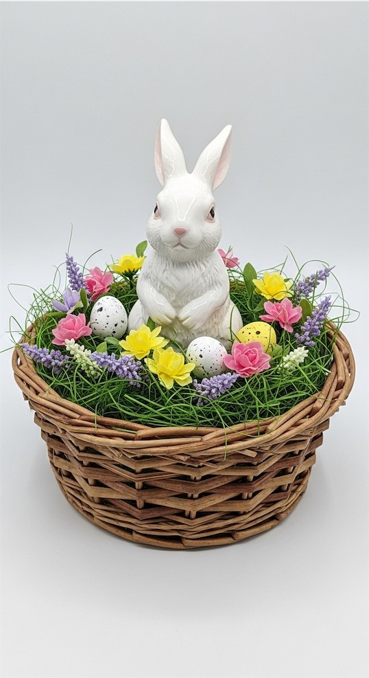 By placing the bunny in the center and surrounding it with grass or florals, you create a story rather than just a container.