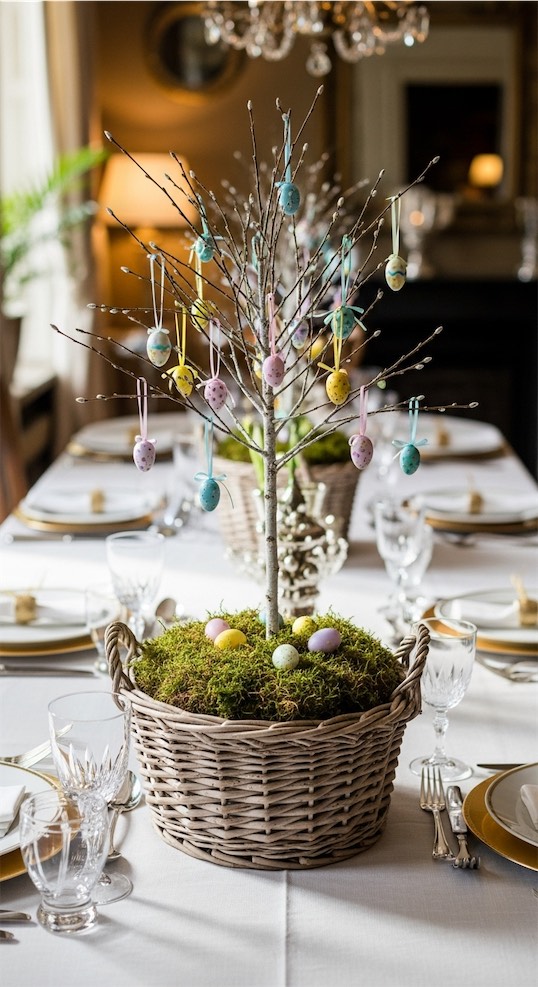 Easter basket centerpiece ideas with height keep the table visually interesting.