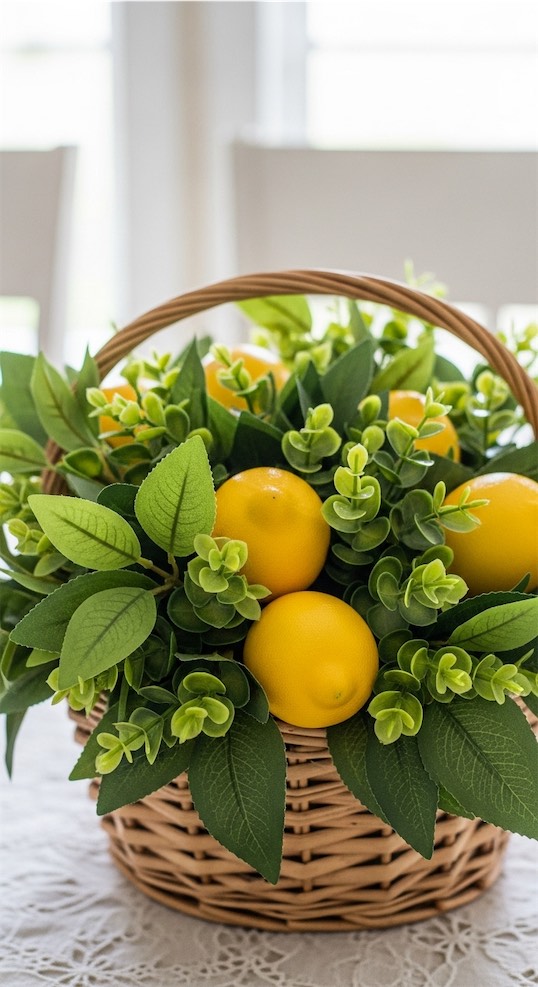 The green leaves create fullness, while the lemons add a pop of color that catches the light on the table.