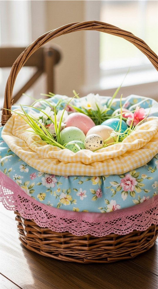 Easter basket centerpiece ideas using fabric liners feel cozy and thoughtful.