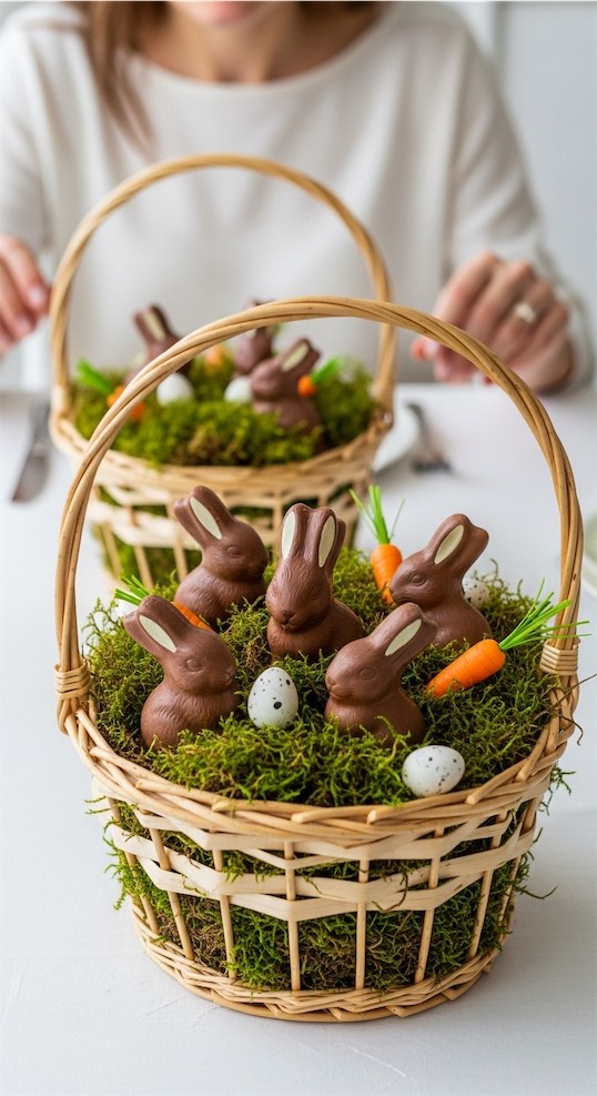 This one always makes people smile the second they sit down. A basket filled with moss and chocolate bunnies feels playful and welcoming.