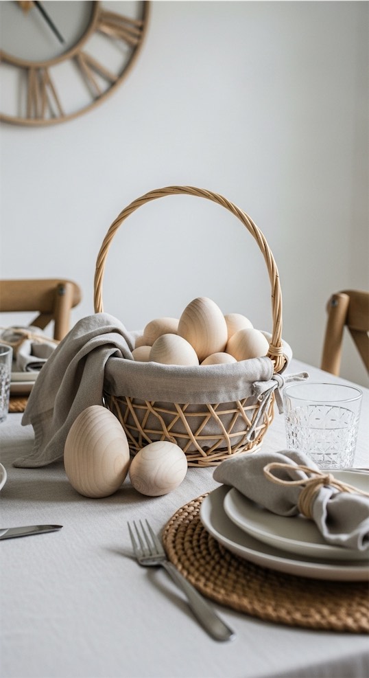 Neutral baskets pair beautifully with wood eggs and soft fabric accents.