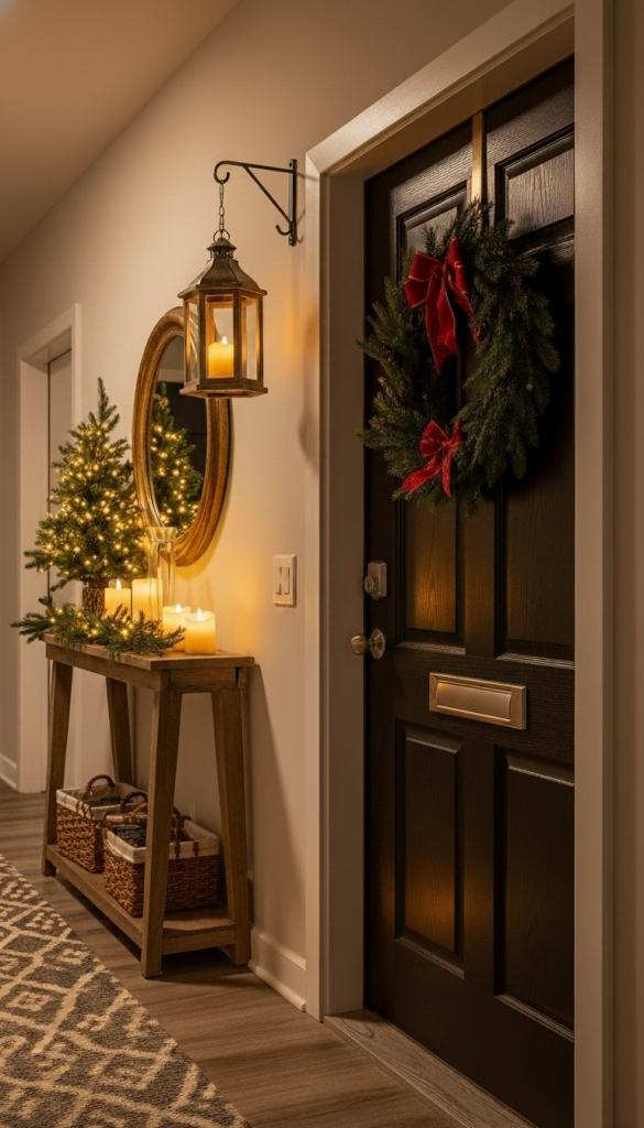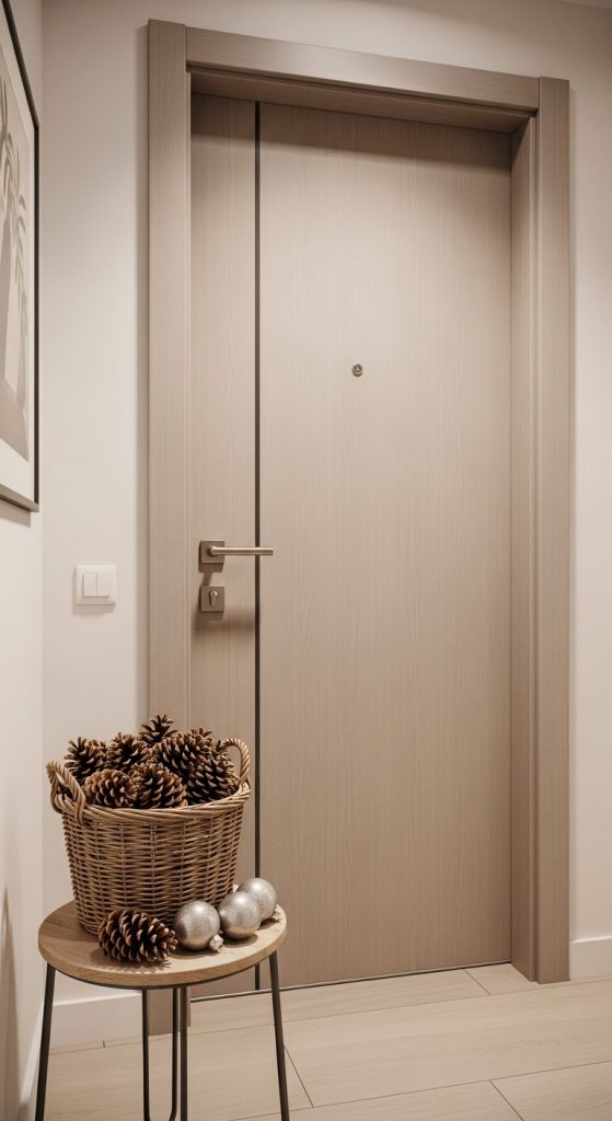 For apartments with wider thresholds, a shallow basket of pinecones or ornaments adds charm without becoming clutter.