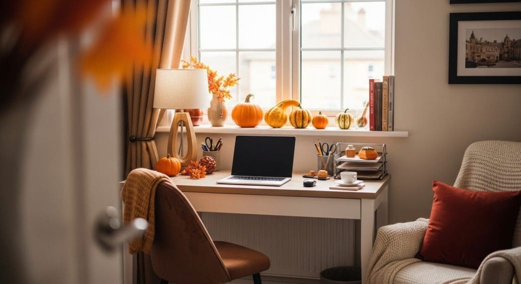We suggest updating your computer or laptop screensaver to a calming autumn scene such as falling leaves, pumpkin patches, or cozy forest views. This decor strategy takes up zero physical space but brings a significant seasonal mood to your desk setup. A fall screensaver transforms your digital environment to match your on-desk decor, creating a cohesive autumn workspace that feels refreshing and inspiring.