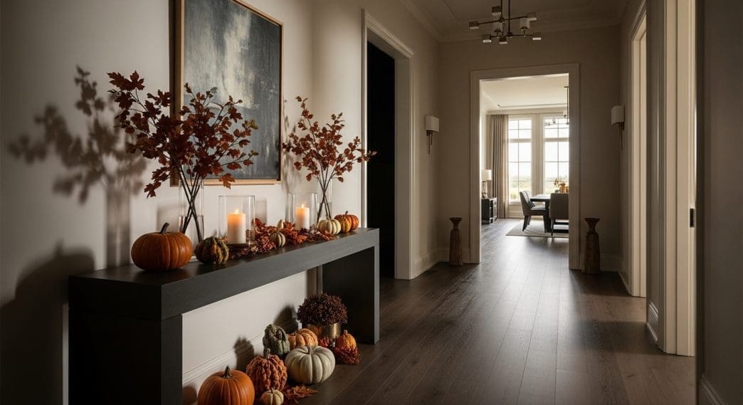 To complete your entryway transformation, we suggest swapping out everyday wall art above the console table for seasonal prints. This approach refreshes the space without needing major changes. Choose art that features autumn landscapes, botanical illustrations, or simple seasonal quotes. Pairing fall-themed artwork with your table decor ensures your entire entryway feels cohesive and seasonally appropriate.