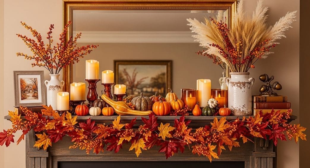 A garland is the ultimate “set it and forget it” mantle decor, especially for fall. Choose one with a mix of faux autumn leaves, berries, and maybe a touch of eucalyptus for freshness. Drape it along the length of your mantle, letting it spill gently over the sides for that effortless, gathered-from-the-garden feel. The soft curves break up the straight line of the mantle, which keeps the display looking relaxed and welcoming. For extra depth, tuck in a few mini pumpkins or pinecones along the garland’s length. This single addition can make your whole fireplace wall feel ready for Thanksgiving in minutes.