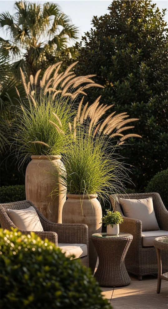 In tall pots, they add height and a soft, airy texture that balances out heavier plants like palms or shrubs.