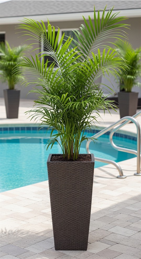 Areca palms are one of my favorite potted plants around pool setups because they’re lightweight, sun-loving, and instantly make the space feel more private.