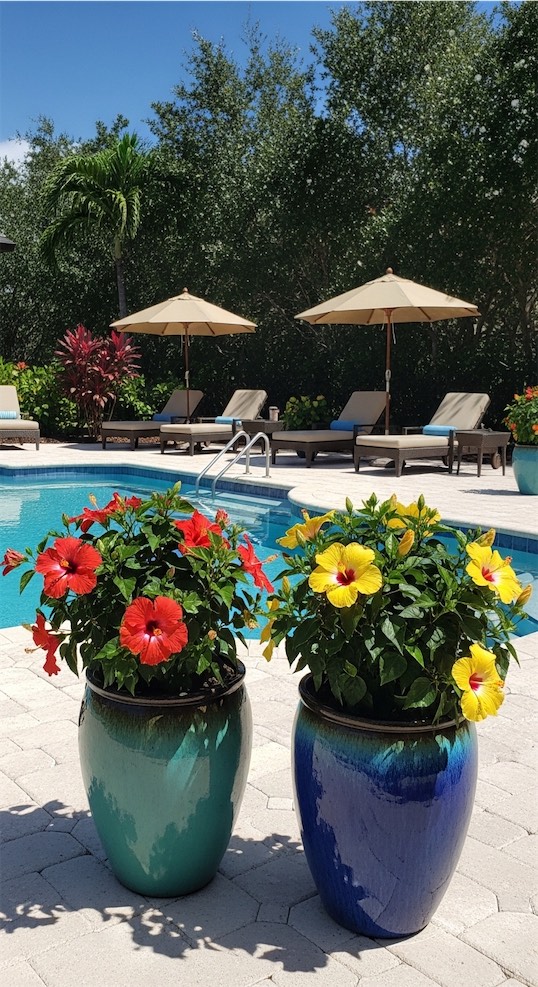 Hibiscus thrives in Florida’s full sun, and those bold red, pink, or yellow flowers instantly give your pool area that vacation vibe.