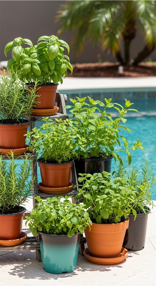 Basil, rosemary, and mint all enjoy Florida sun and can thrive in pots near your pool.