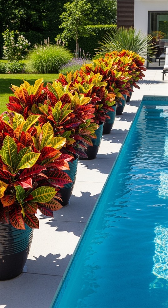 Their leaves come in shades of red, orange, yellow, and green, which instantly energizes your pool area. As potted plants around pool spaces, they add visual interest even when nothing is blooming.