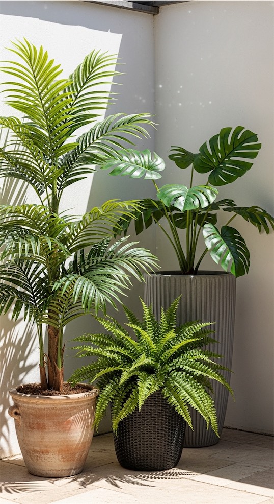 Modern artificial palms or ferns look surprisingly realistic, especially when styled in textured outdoor pots.