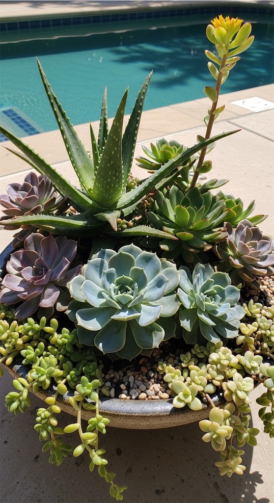 Using wide, shallow bowls and mixing varieties like echeveria, aloe, and jade. It feels curated without being complicated. Place them on side tables, steps, or along the pool edge for subtle detail.