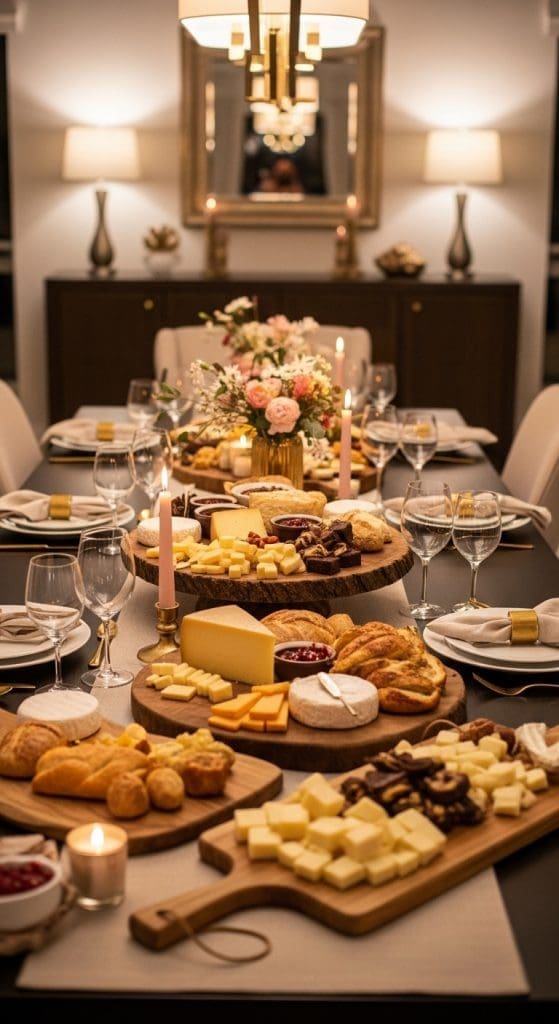 Serving cheese, bread, or desserts on wooden cutting boards adds that relaxed Friendsgiving vibe.
