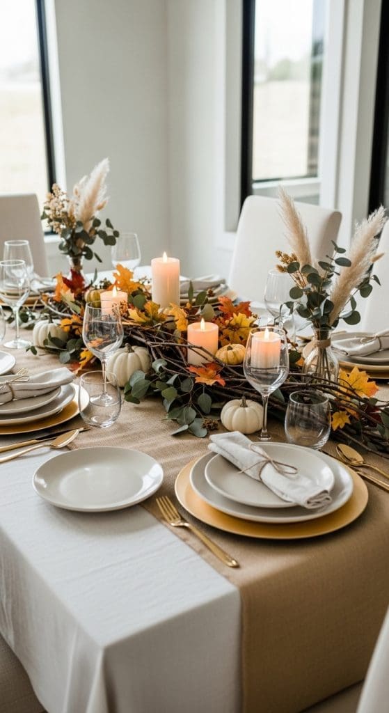 Start with a neutral base like a cream tablecloth or soft beige runner. This sets a calm foundation and lets the rest of your decor shine.