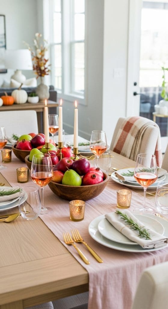 Instead of traditional centerpieces, use bowls of seasonal fruit like apples, pears, or pomegranates.