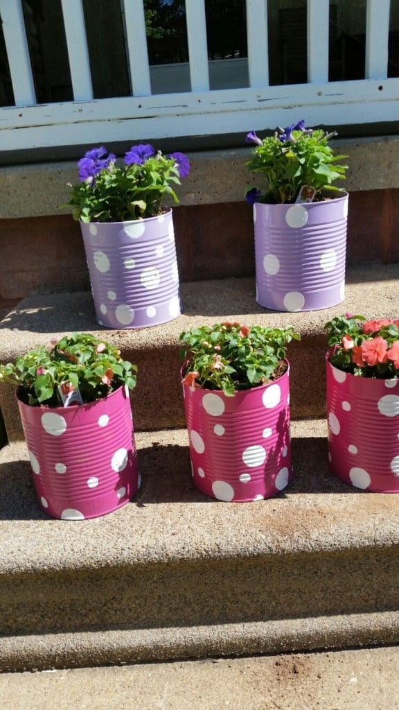 Old Cans make great planters, especially if you have limited space! You can drill some holes in the bottom, line with gravel and add some soil! These create cute mini geranium planters!