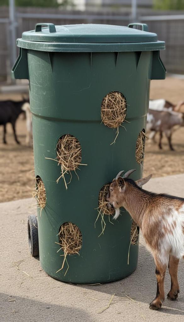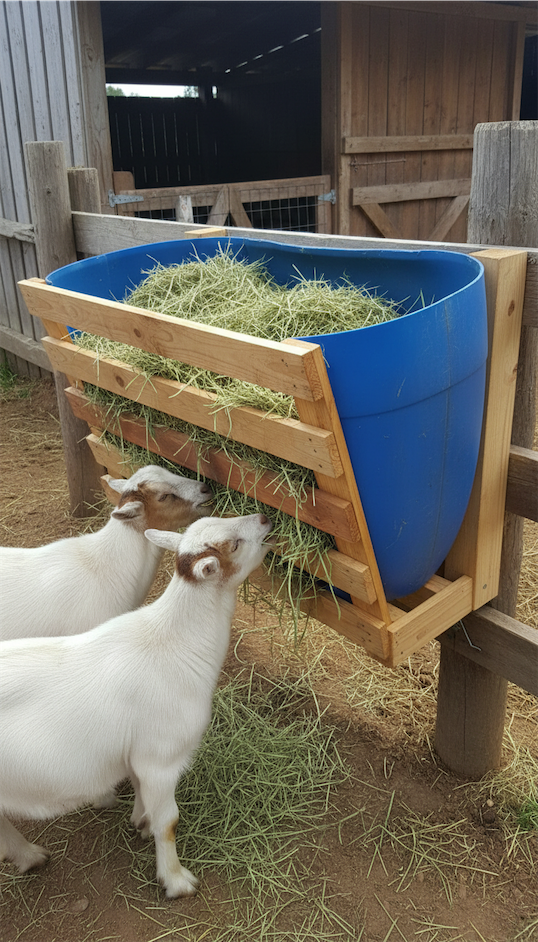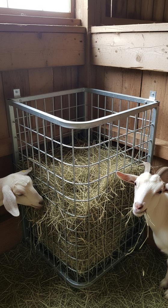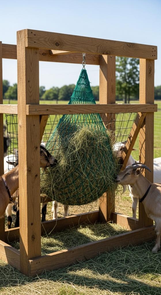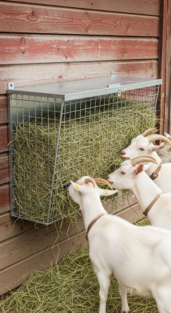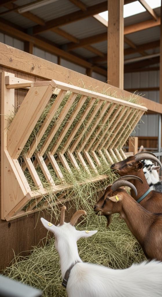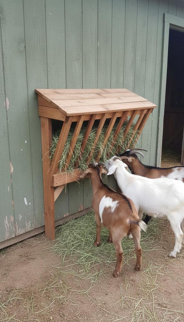 This goat hay feeder DIY option blends accessibility with protection.