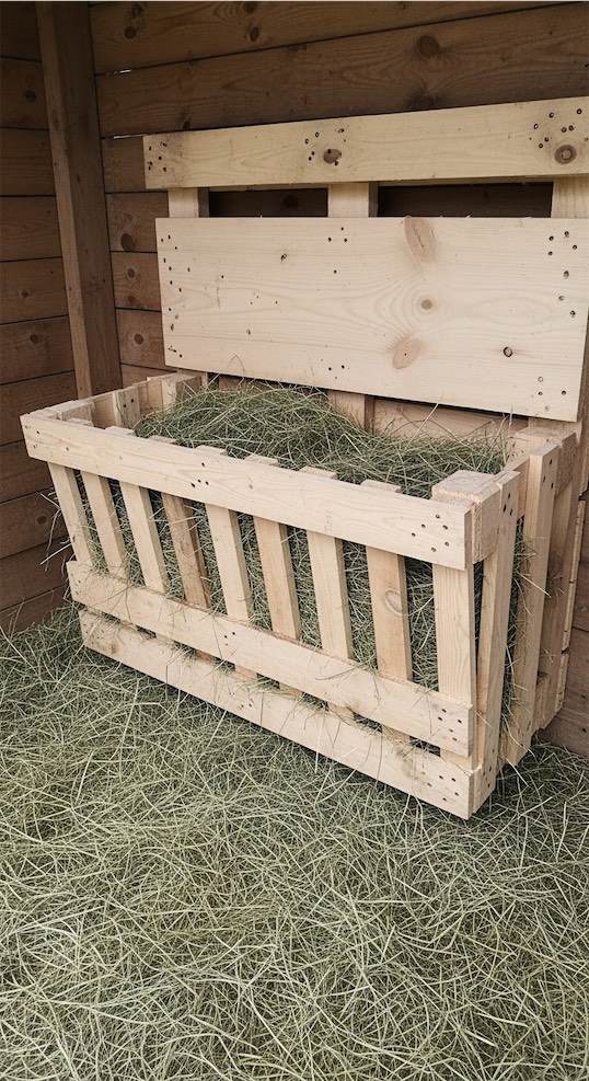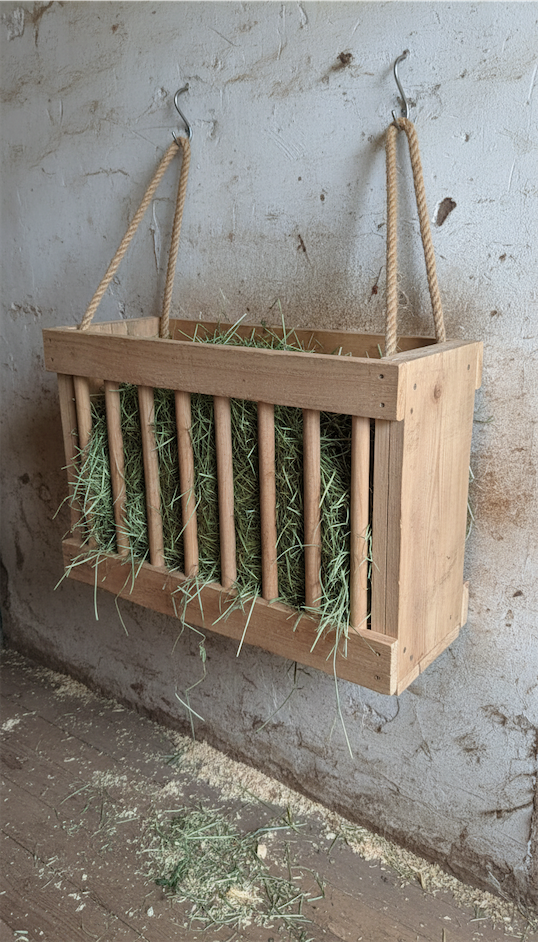 Suspending a hay net inside a wooden frame combines slow feeding with structure and safety.