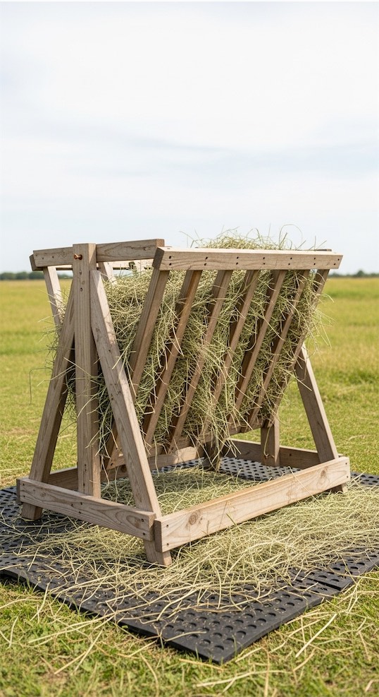 Damp hay quickly becomes bedding instead of feed, so covering the feeder directly reduces waste and saves money.