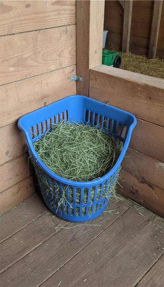 A rigid plastic laundry basket mounted sideways becomes an instant slow-feed hay holder.