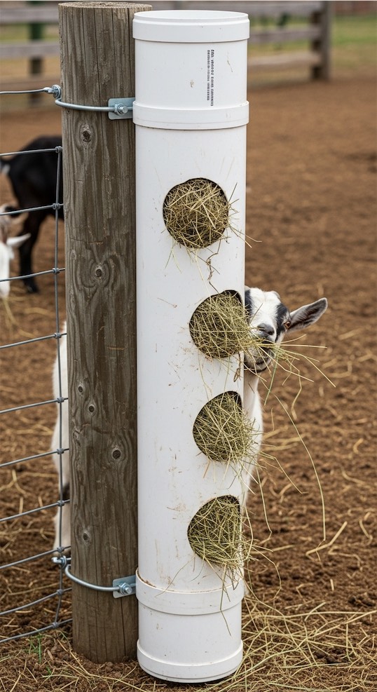 A large vertical PVC pipe with feeding holes acts as a compact hay chamber.