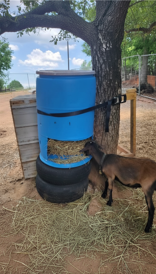 A cut barrel mounted in a corner or tied to a tree is a great DIY goat feeder.