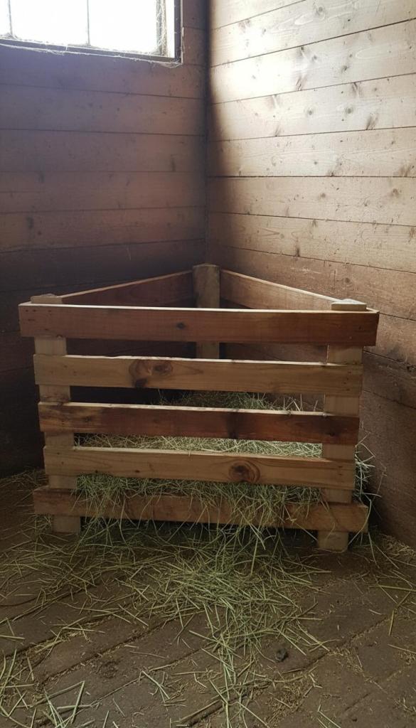 A triangular slat rack fitted into a stall corner creates a stable feeding angle goats naturally prefer.