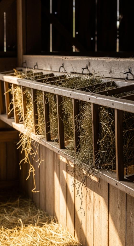 A slim wooden rack mounted inside a stall keeps hay off bedding and contained in a vertical plane.