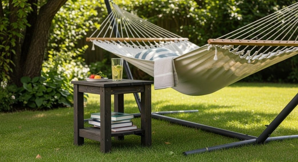 We recommend adding a small weatherproof side table next to your hammock for books, drinks, or devices. Combine this with a shaded overhead canopy and turn your backyard hammock into a functional reading retreat. The logic here is usability: if the hammock area serves multiple functions, you’ll use it more often.