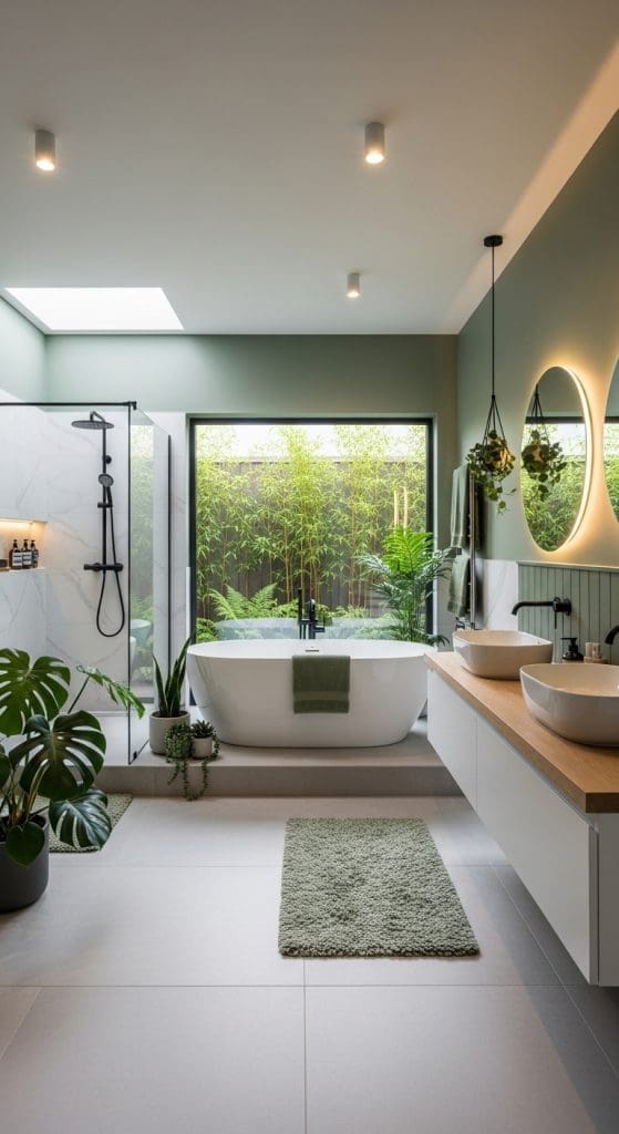 Your wall or tile color sets the entire tone for a bathroom. Soft, muted tones like sage green, warm taupe, or powder blue instantly create a relaxing backdrop.
